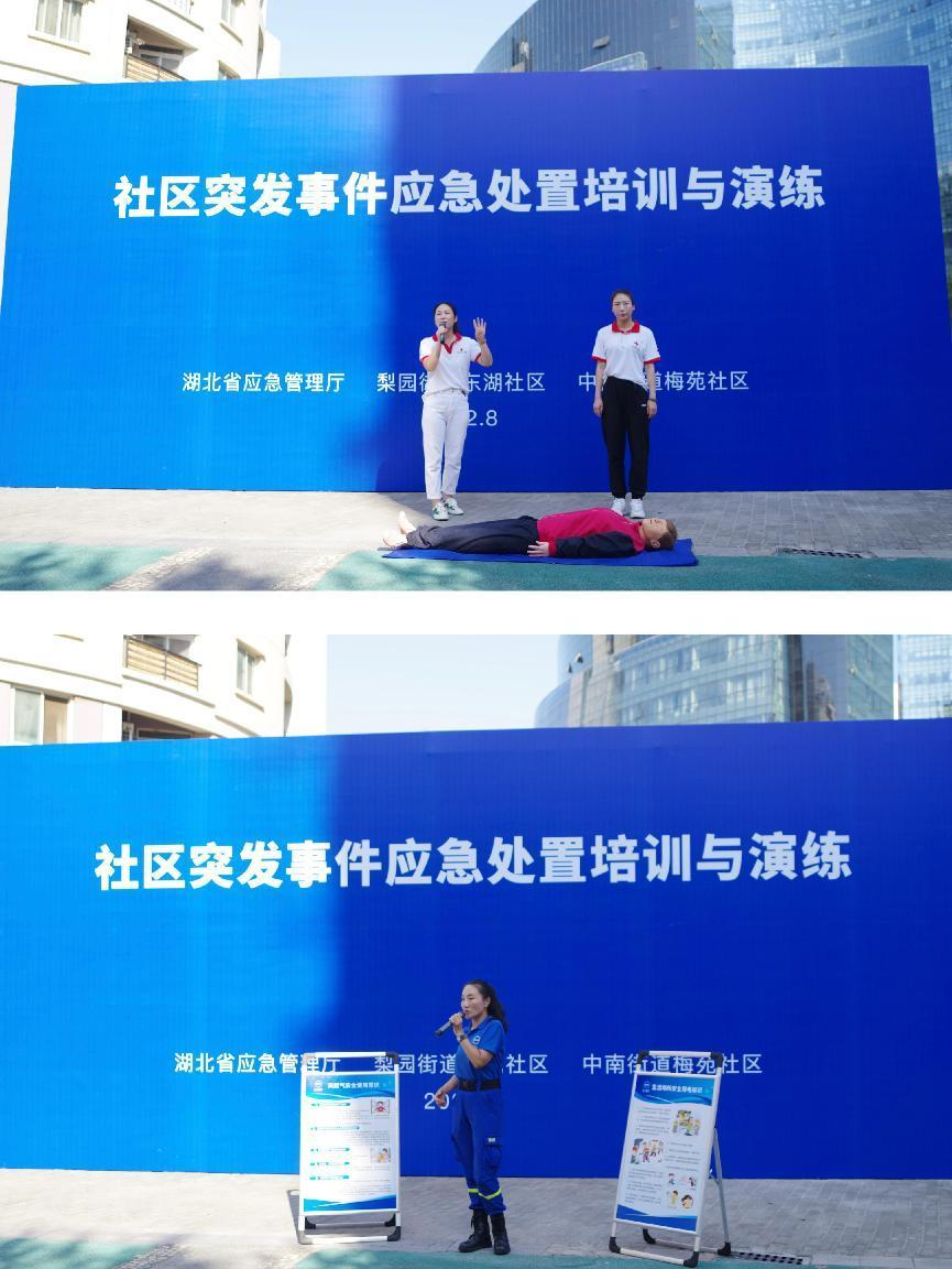此次演练包含应急处置能力培训、社区突发事件应急处置演练与应急科普宣传三部分,采取展板与科普视频结合,讲解示范与操作互动结合,情况诱导与现场处置结合的方式组织实施。武汉市宝捷应急救援队、安能武汉救援基地、武汉蓝天救援队与湖北省红十字会分别就不同主题开展培训与演练。